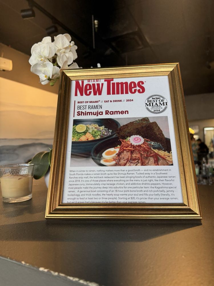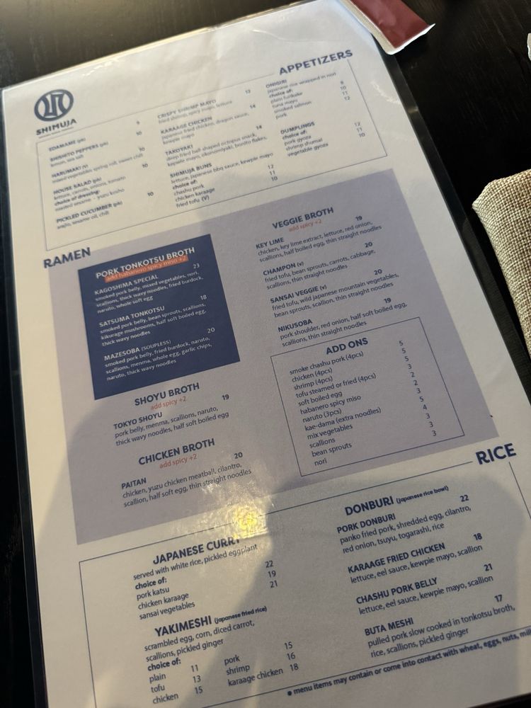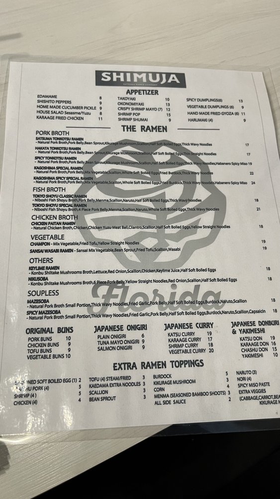 Shimuja Ramen in Southwest Ranches offers a wide range of Asian Fusion dishes with a focus on Ramen. The menu includes appetizers like Edamame, Karaage Fried Chicken, and Shishito Peppers, as well as buns, onigiri, and various Ramen options. Customers praise the flavorful dishes, with favorites like the Pork Shimuja Buns and the Kagoshima Special Ramen standing out. The cozy ambiance, friendly service, and extensive menu options make Shimuja a top choice for ramen lovers in the Broward area. Whether you're looking for a casual lunch spot or a trendy dinner destination, Shimuja Ramen is sure to impress with its authentic flavors and generous portions.